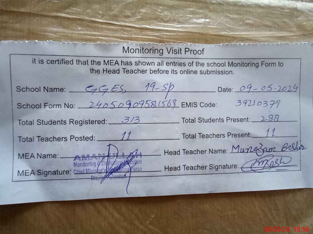 | Attendance Register | Head Teacher | MEA with School | Visit Proof |