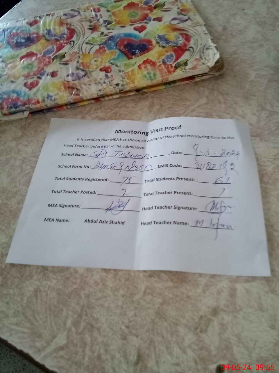 | Attendance Register | Head Teacher | MEA with School | Visit Proof |