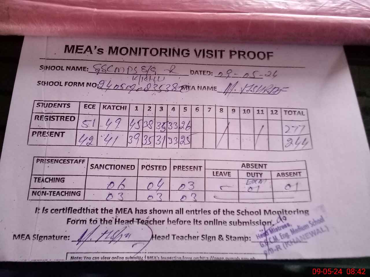 | Attendance Register | Head Teacher | MEA with School | Visit Proof |