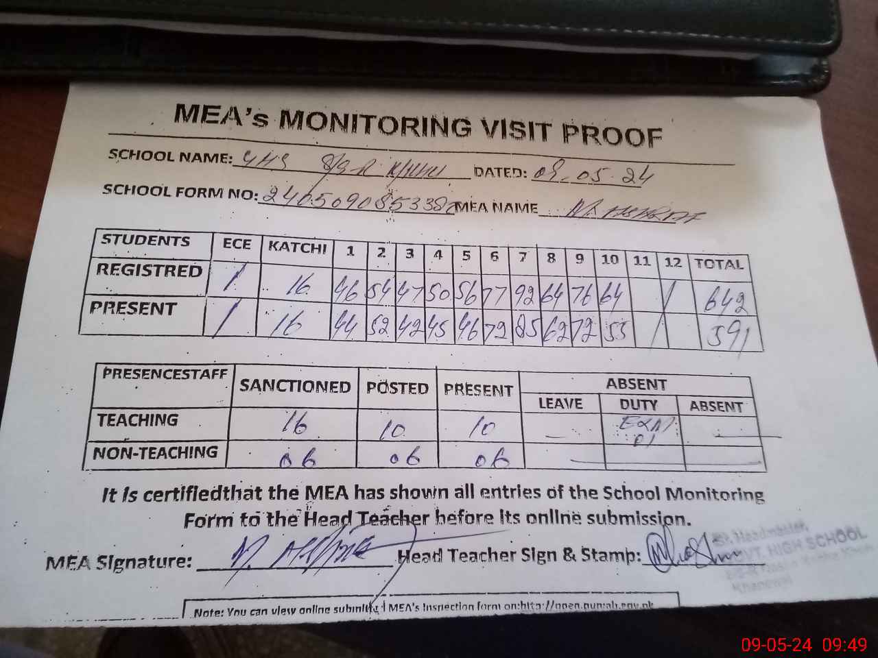 | Attendance Register | Head Teacher | MEA with School | Visit Proof |