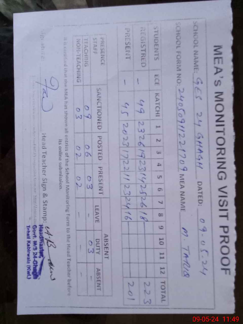 | Attendance Register | Head Teacher | MEA with School | Visit Proof |