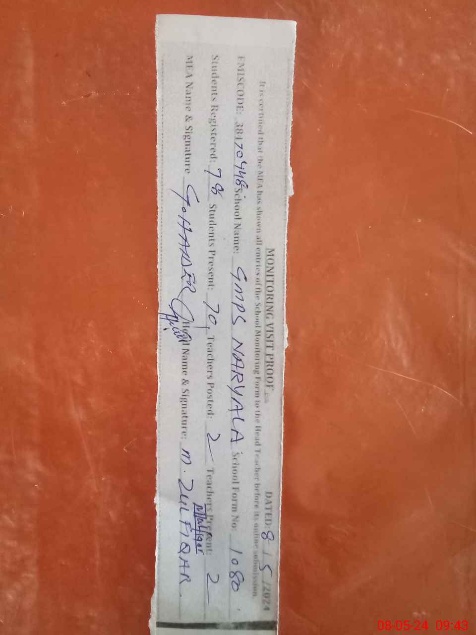 | Monitoring Date: 08-05-2024 | Start Time: 08-05-2024 09:24 AM | End Time: 08-05-2024 09:43 AM | Name of MEA: GH**** HA**** | |