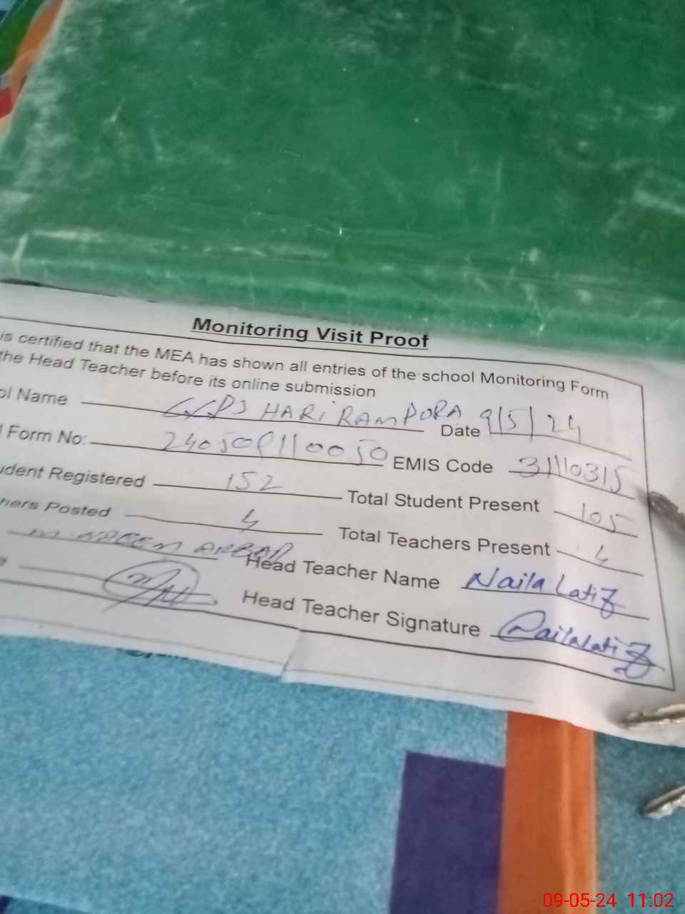 | Attendance Register | Head Teacher | MEA with School | Visit Proof |