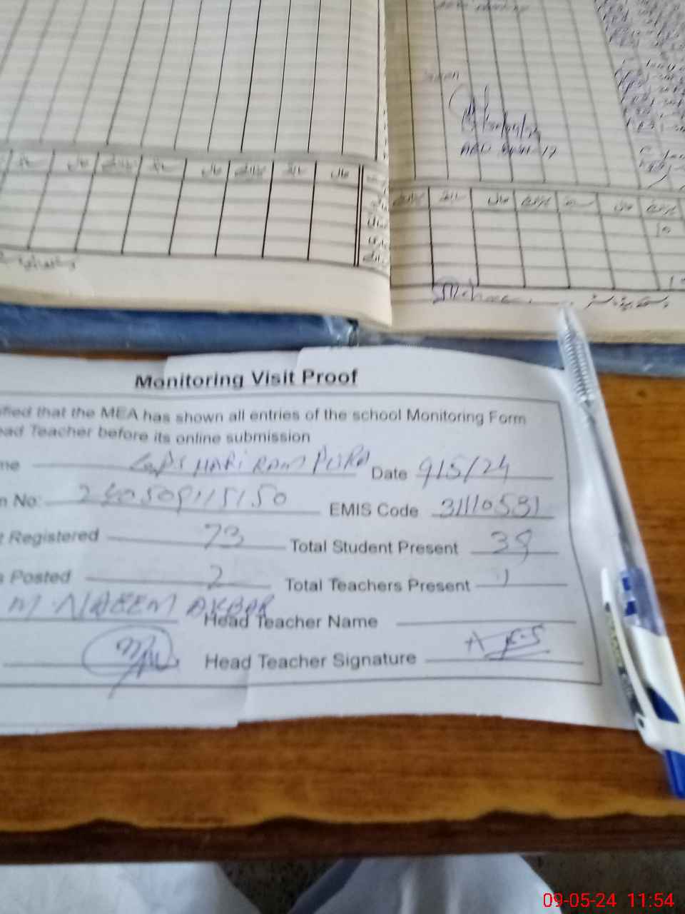 | Attendance Register | Head Teacher | MEA with School | Visit Proof |
