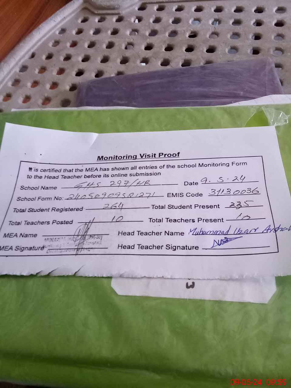 | Attendance Register | Head Teacher | MEA with School | Visit Proof |
