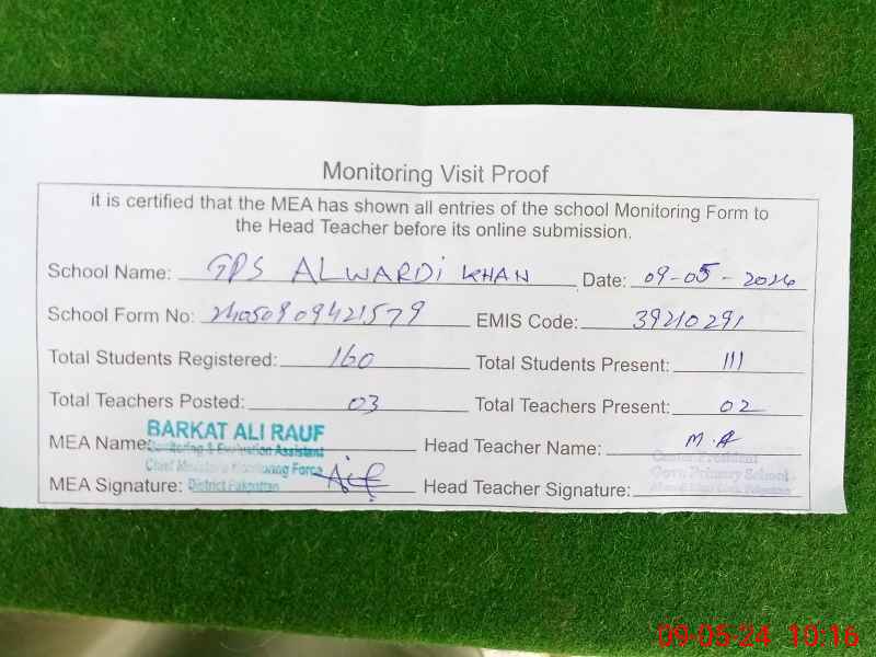 | EMIS Code: 39210291 | Name of School: GPS ALWARDI KHAN | |||