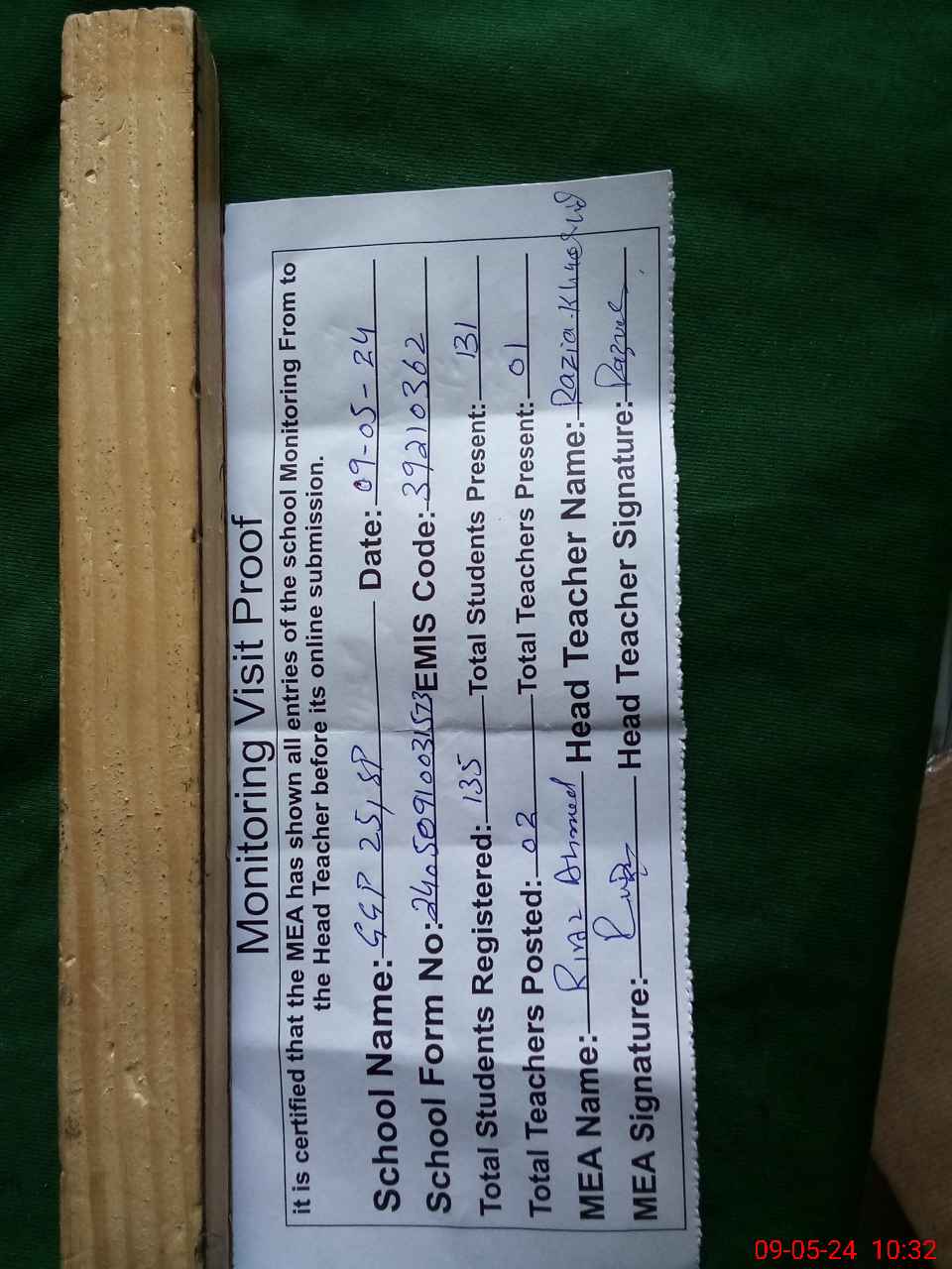 | Attendance Register | Head Teacher | MEA with School | Visit Proof |
