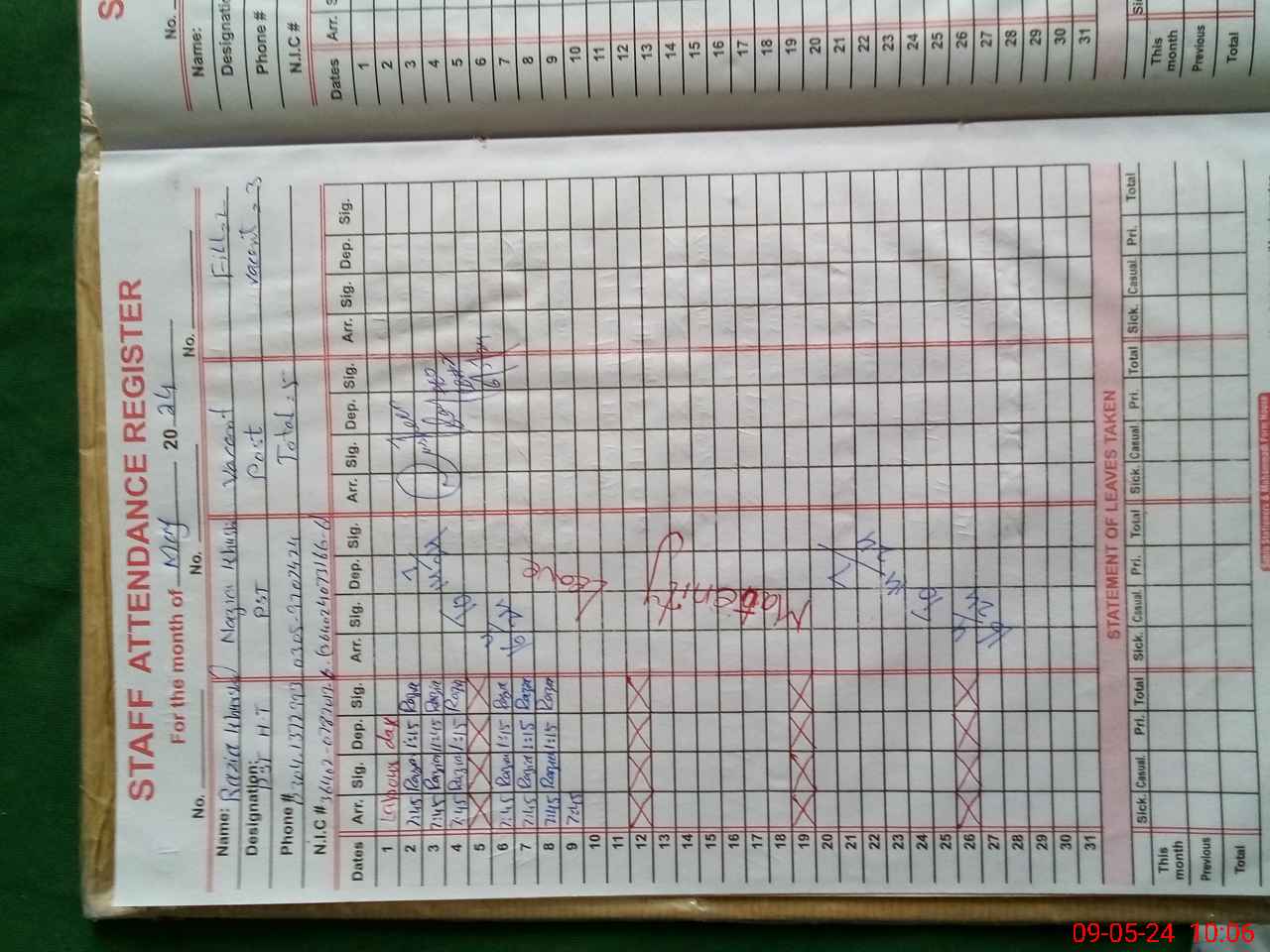 | CNIC | Full Name | Designation | R/C | Absence During Last Calender Month |
