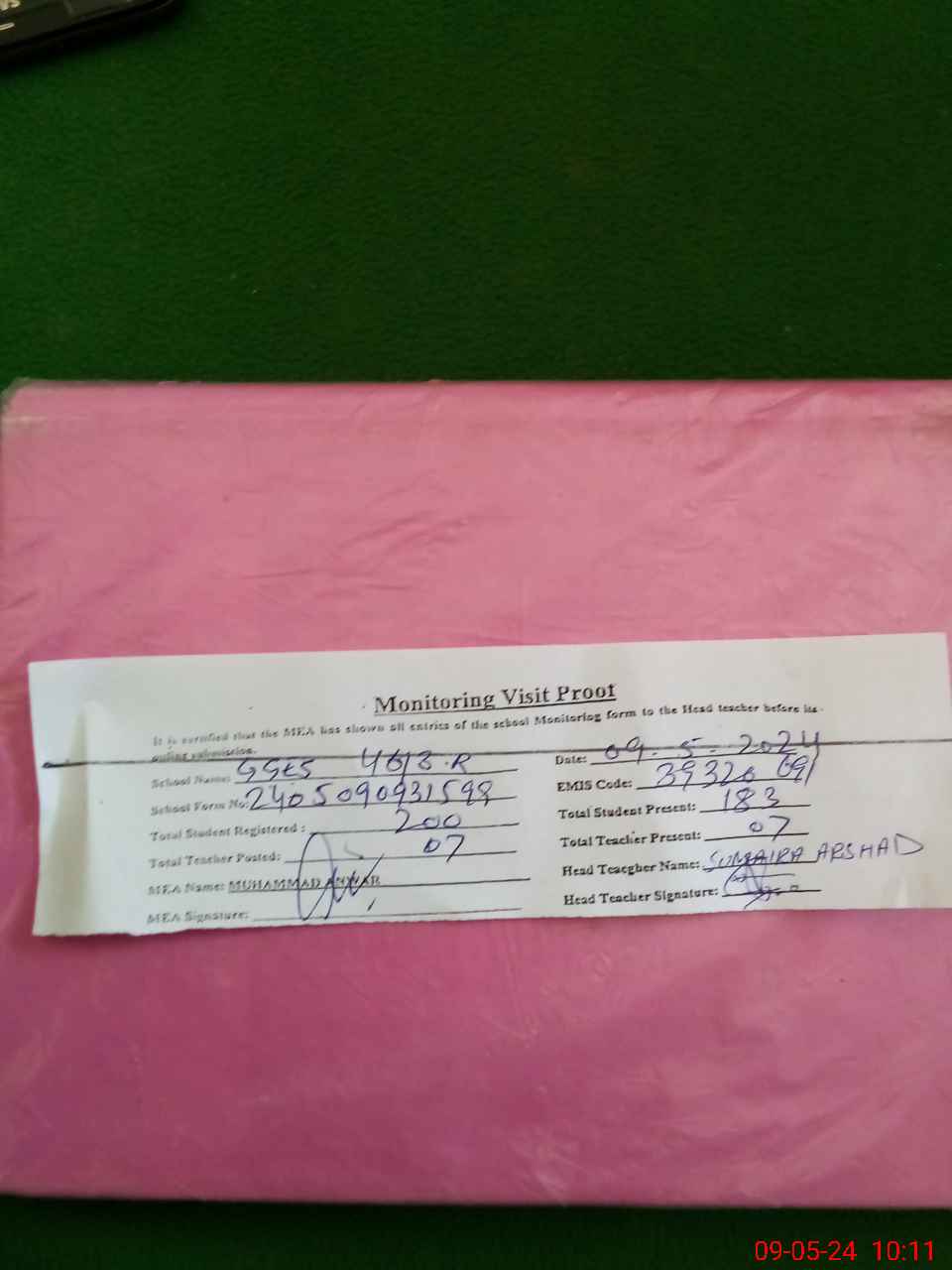 | Attendance Register | Head Teacher | MEA with School | Visit Proof |