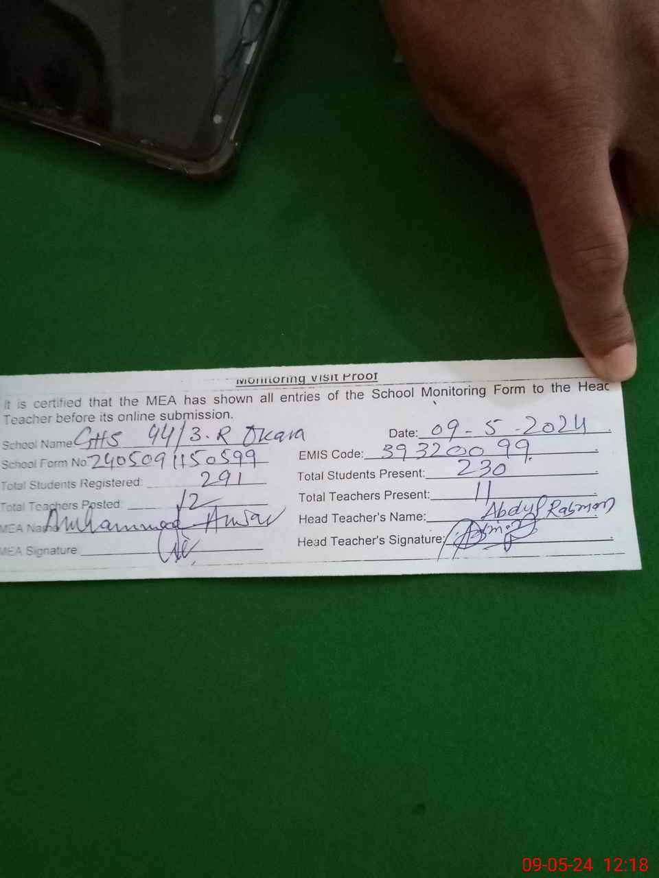 | Attendance Register | Head Teacher | MEA with School | Visit Proof |