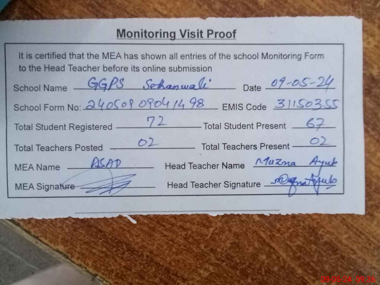 | Attendance Register | Head Teacher | MEA with School | Visit Proof |