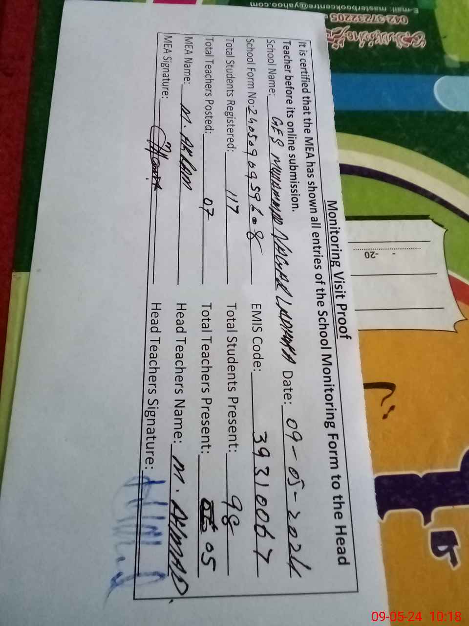| Attendance Register | Head Teacher | MEA with School | Visit Proof |