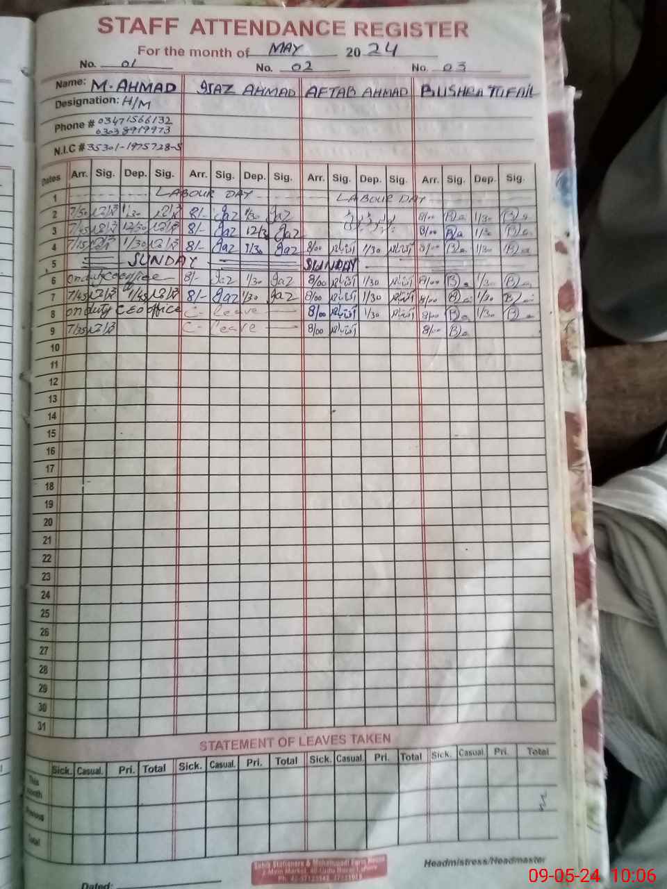 | CNIC | Full Name | Designation | R/C | Absence during last cal. month |