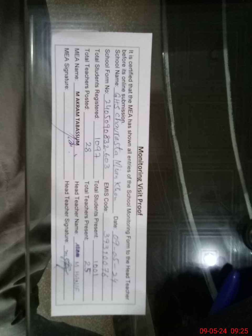 | Attendance Register | Head Teacher | MEA with School | Visit Proof |