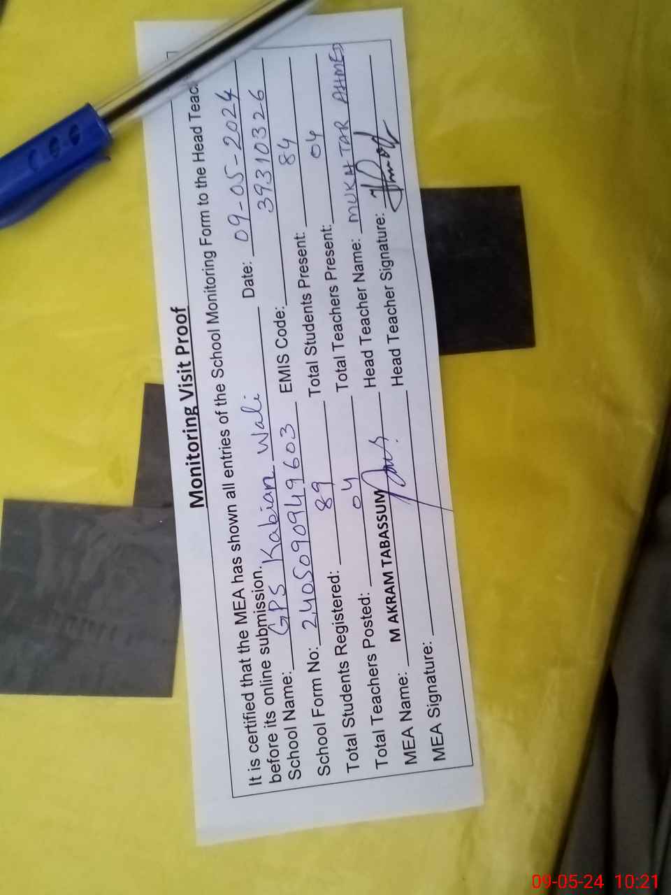 | Attendance Register | Head Teacher | MEA with School | Visit Proof |