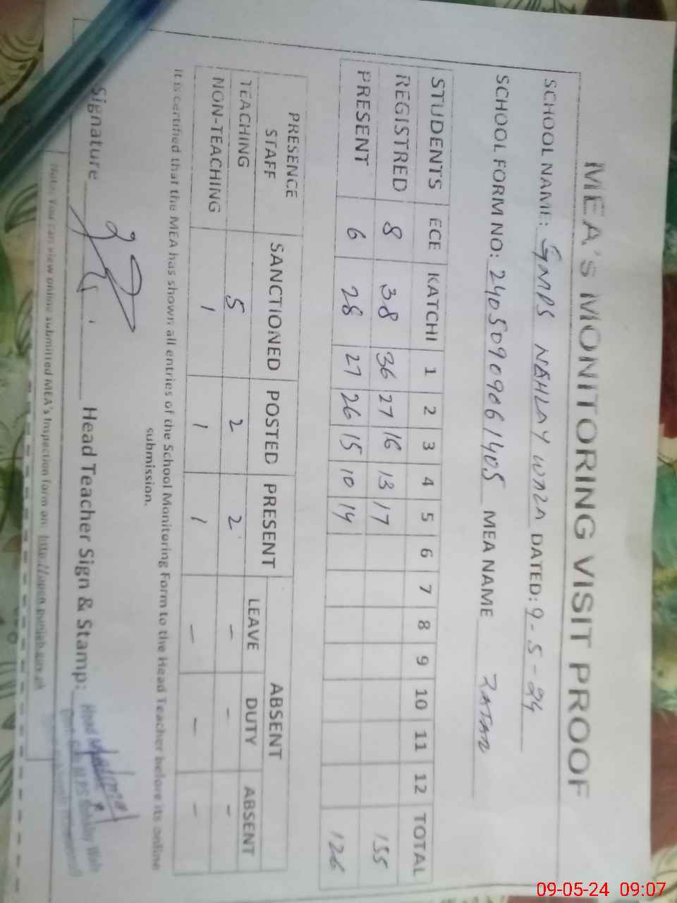 | Attendance Register | Head Teacher | MEA with School | Visit Proof |