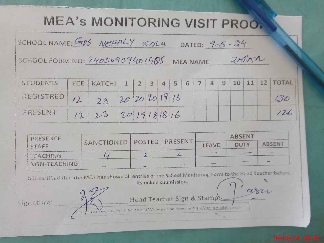 | Attendance Register | Head Teacher | MEA with School | Visit Proof |