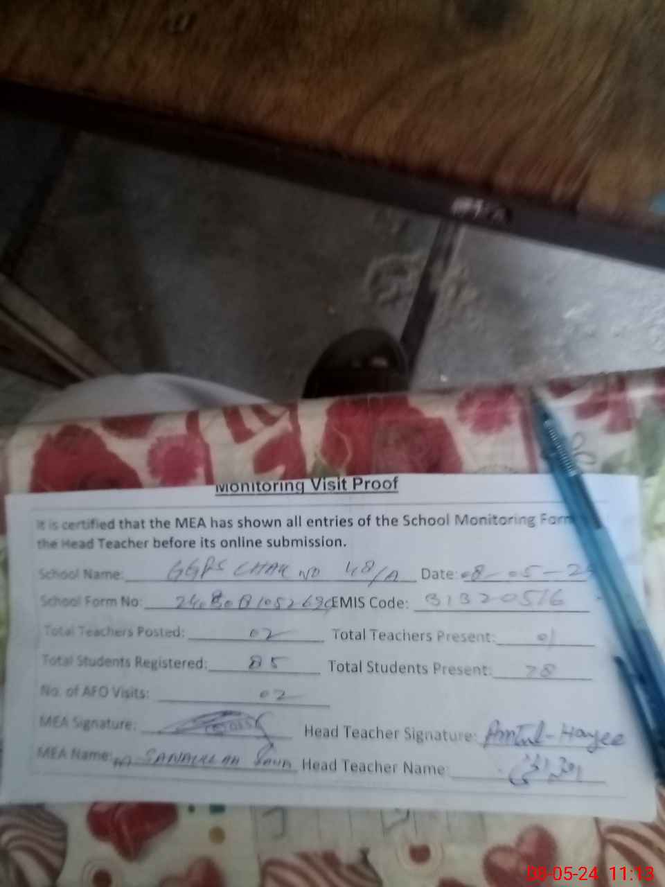 | Monitoring Date: 08-05-2024 | Start Time: 08-05-2024 10:52 AM | End Time: 08-05-2024 11:13 AM | Name of MEA: Mu**** Sa**** Ul**** Sa**** | |