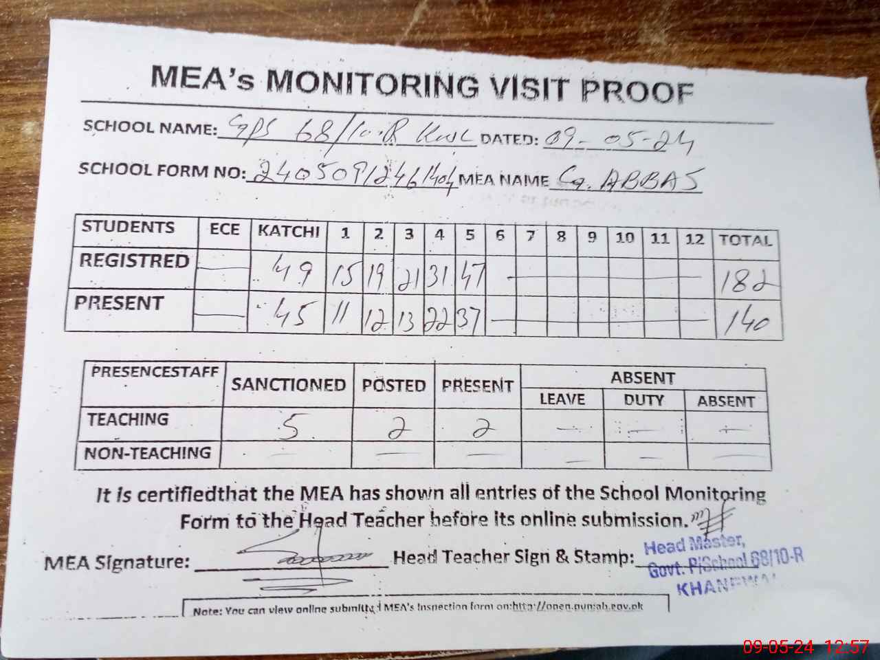 | Attendance Register | Head Teacher | MEA with School | Visit Proof |