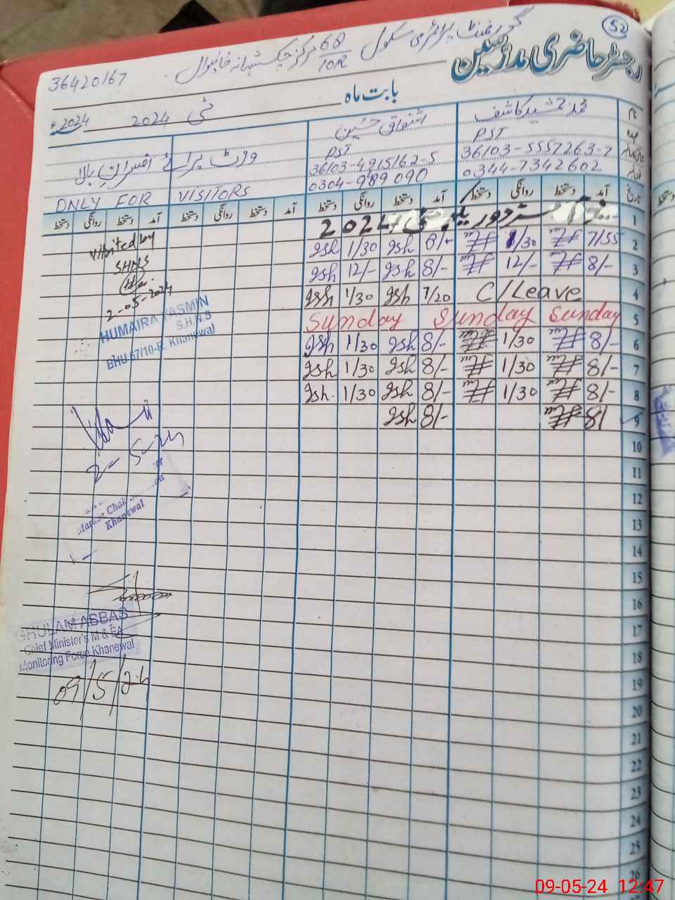 | School Visited by School Health & Nutrition Supervisor (No. of Visits) | 1 | Name1: | Humaira Yasmeen | Name2: | |