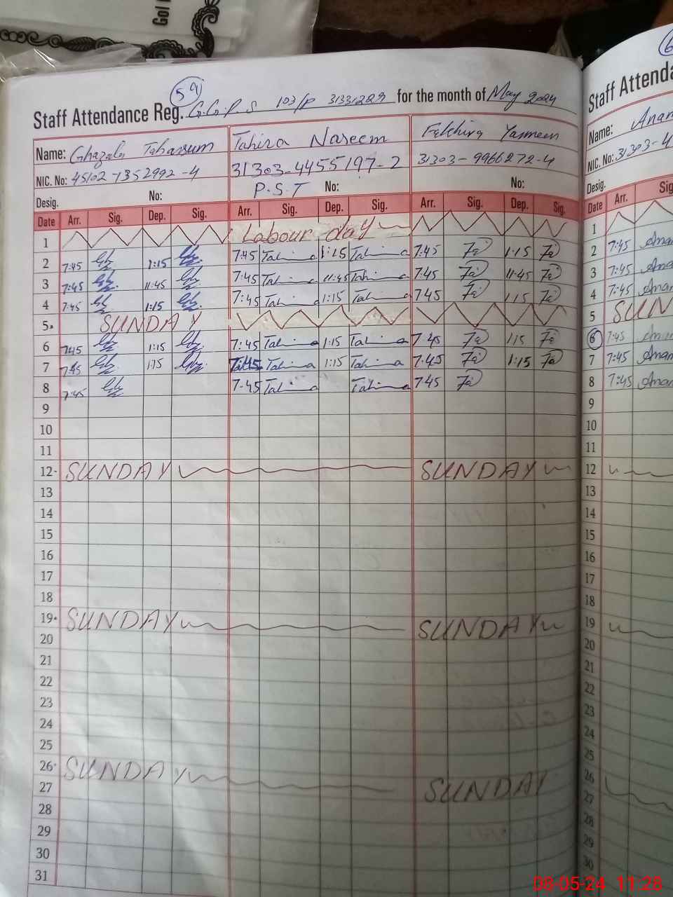 | CNIC | Full Name | Designation | R/C | Absence During Last Calender Month |