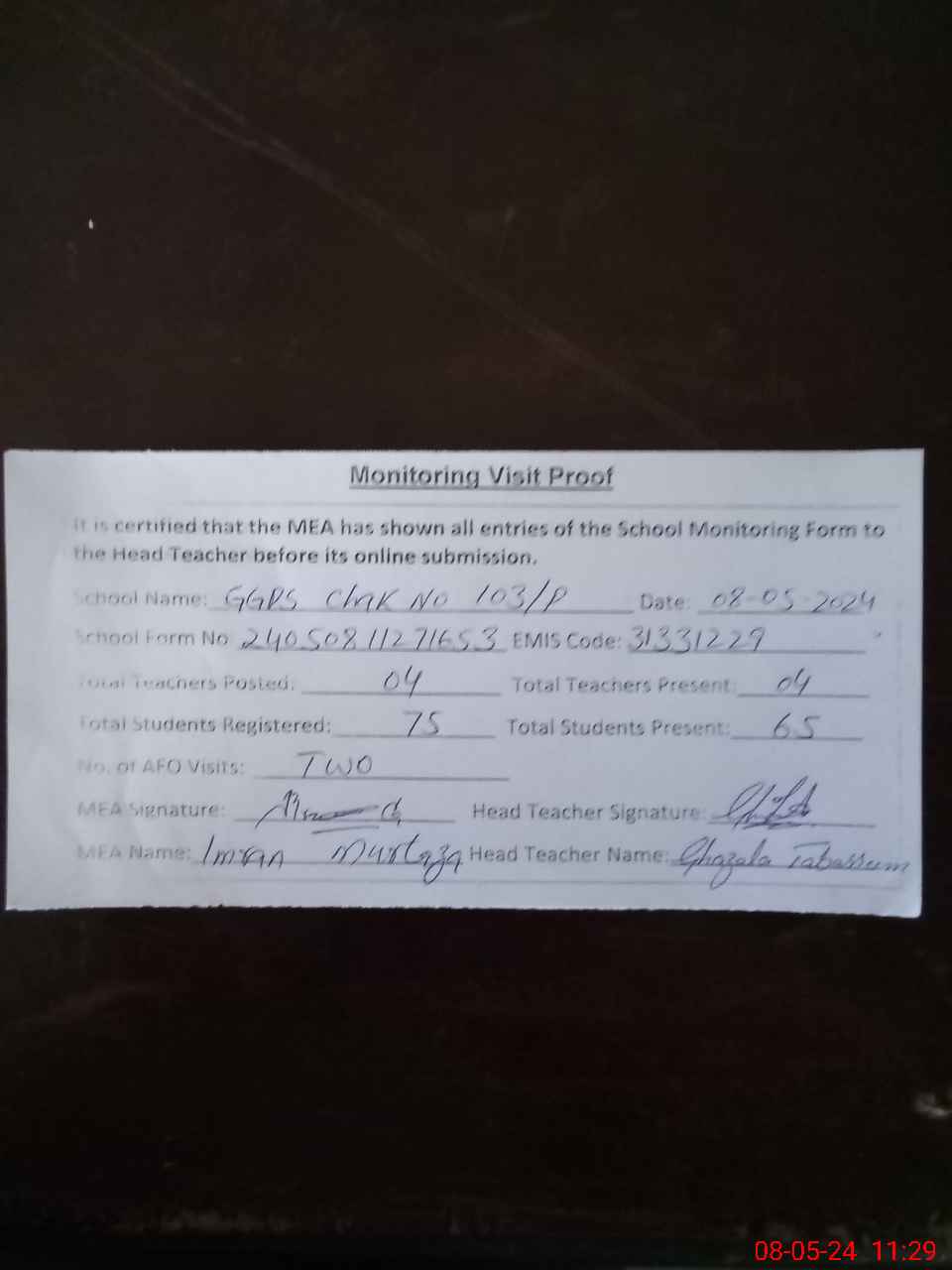 | Attendance Register | Head Teacher | MEA with School | Visit Proof |
