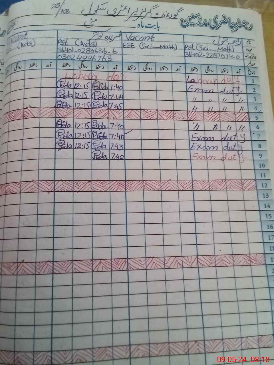 | 36**** | Ra**** Ba**** | 2 | 2 | 12 | 0 | 0 | 0 | 0 | 0 | 0 | 2 | Exam Duty | |