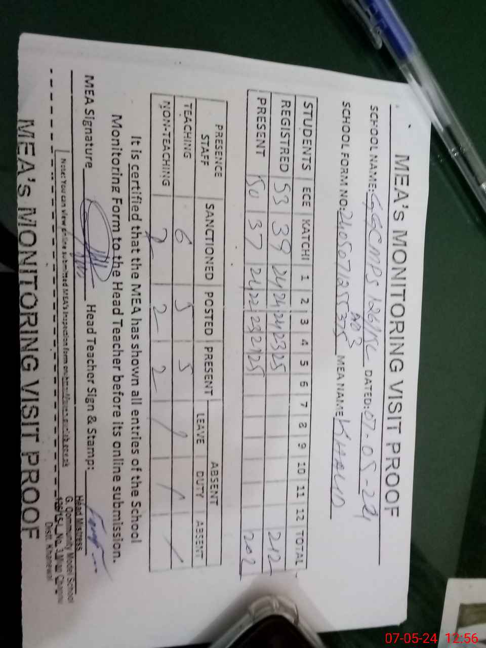 | Attendance Register | Head Teacher | MEA with School | Visit Proof |