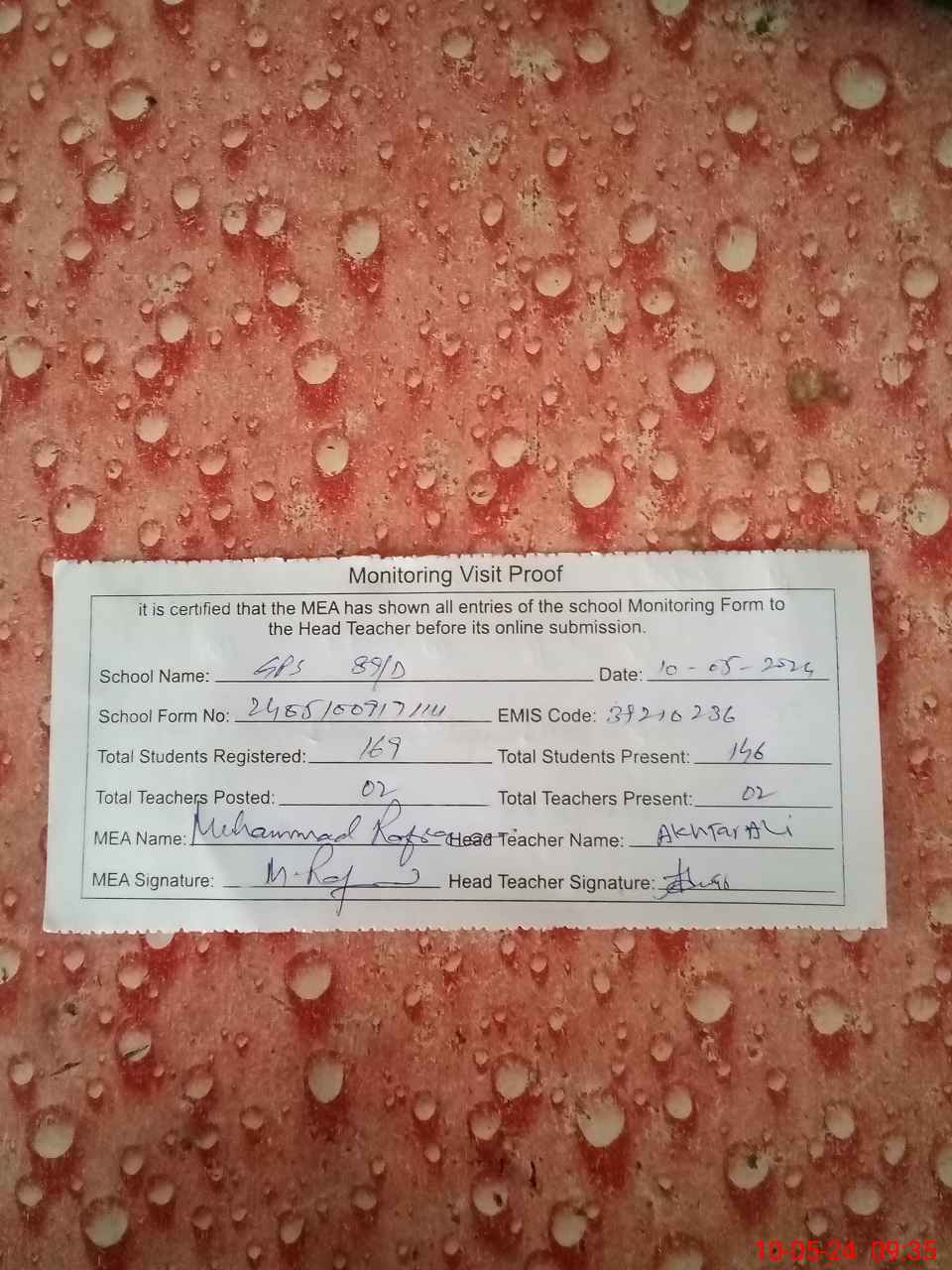| Attendance Register | Head Teacher | MEA with School | Visit Proof |