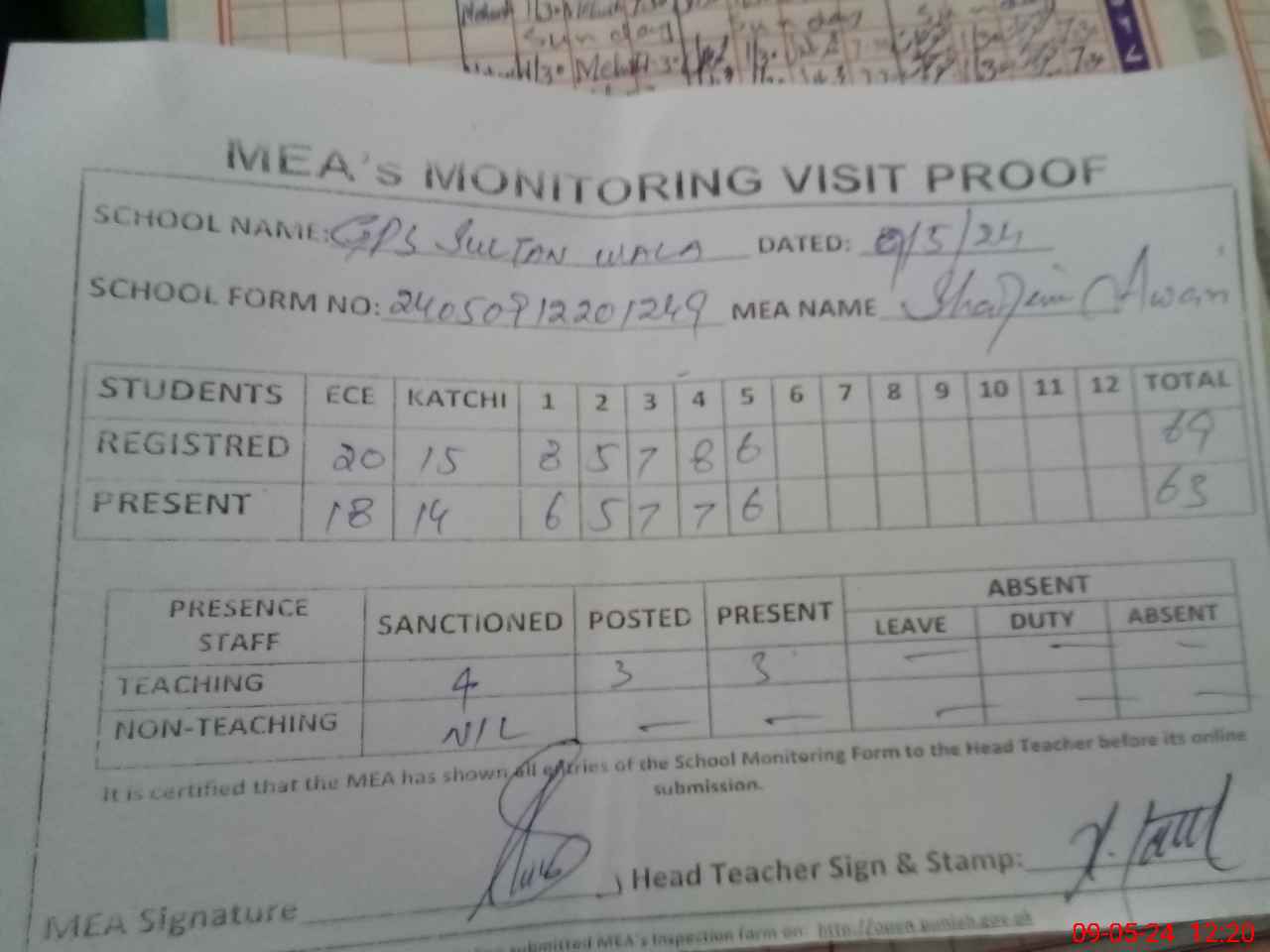 | Attendance Register | Head Teacher | MEA with School | Visit Proof |