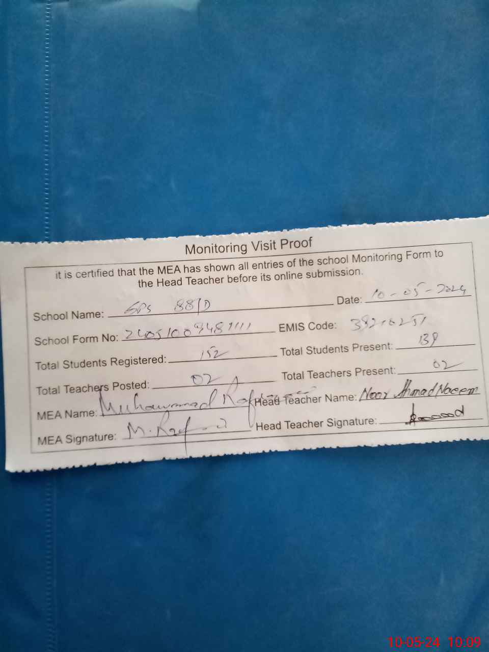 | Certified that this School was Inspected by the Undersigned MEA/DMO Today and the Information Stated Above is as Per Record. | |||||