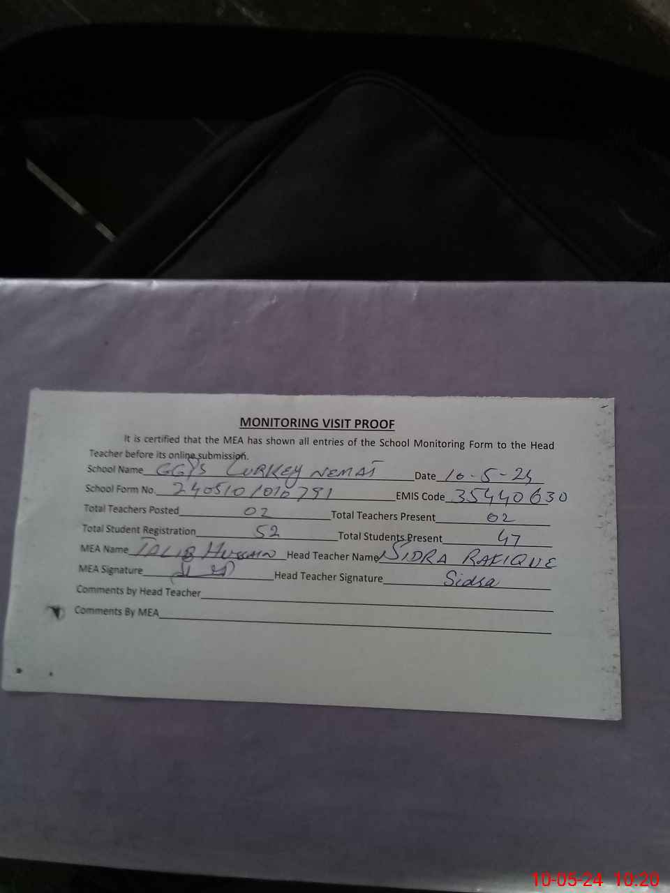 | Attendance Register | Head Teacher | MEA with School | Visit Proof |