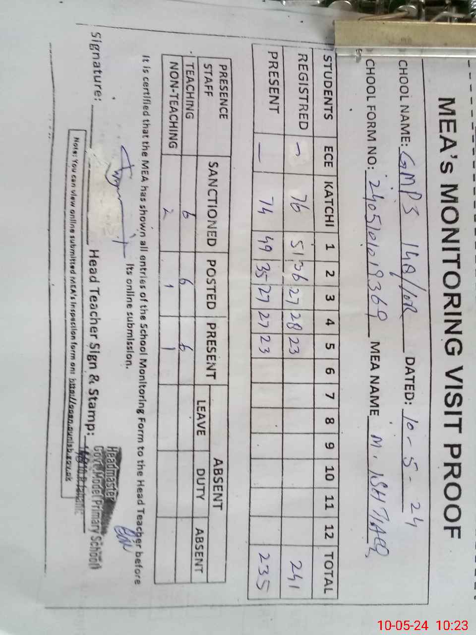 | Attendance Register | Head Teacher | MEA with School | Visit Proof |