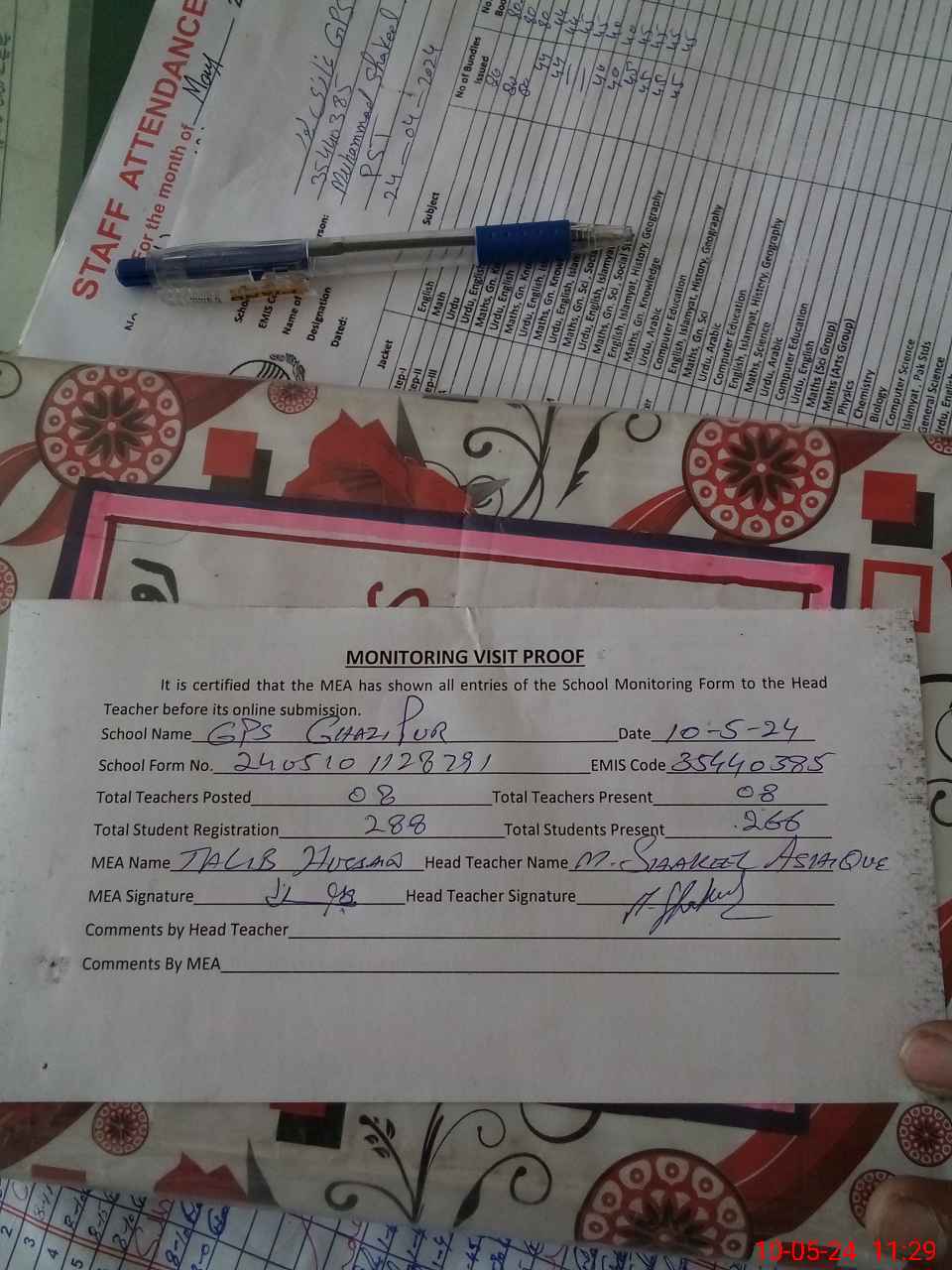 | Attendance Register | Head Teacher | MEA with School | Visit Proof |