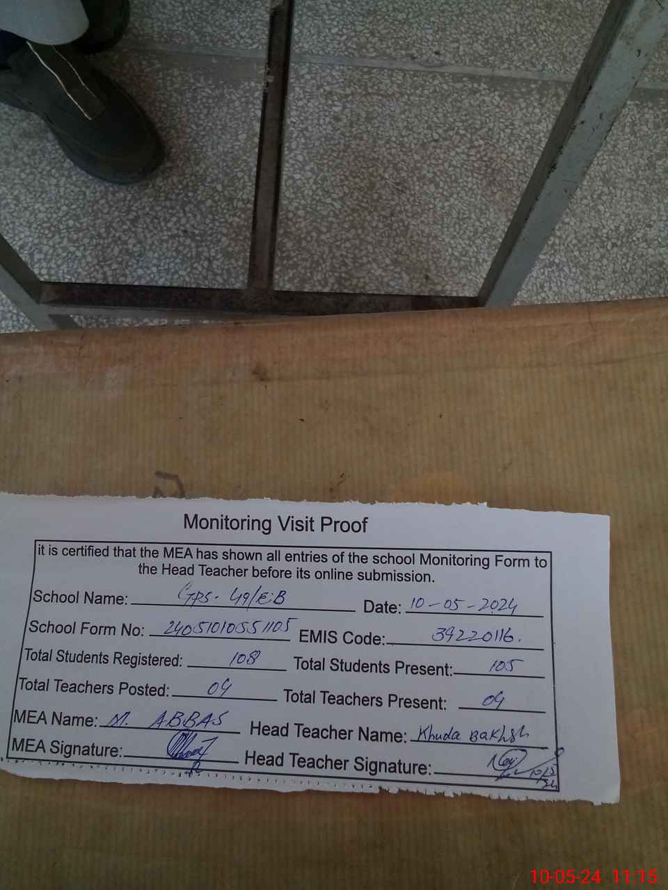 | Attendance Register | Head Teacher | MEA with School | Visit Proof |