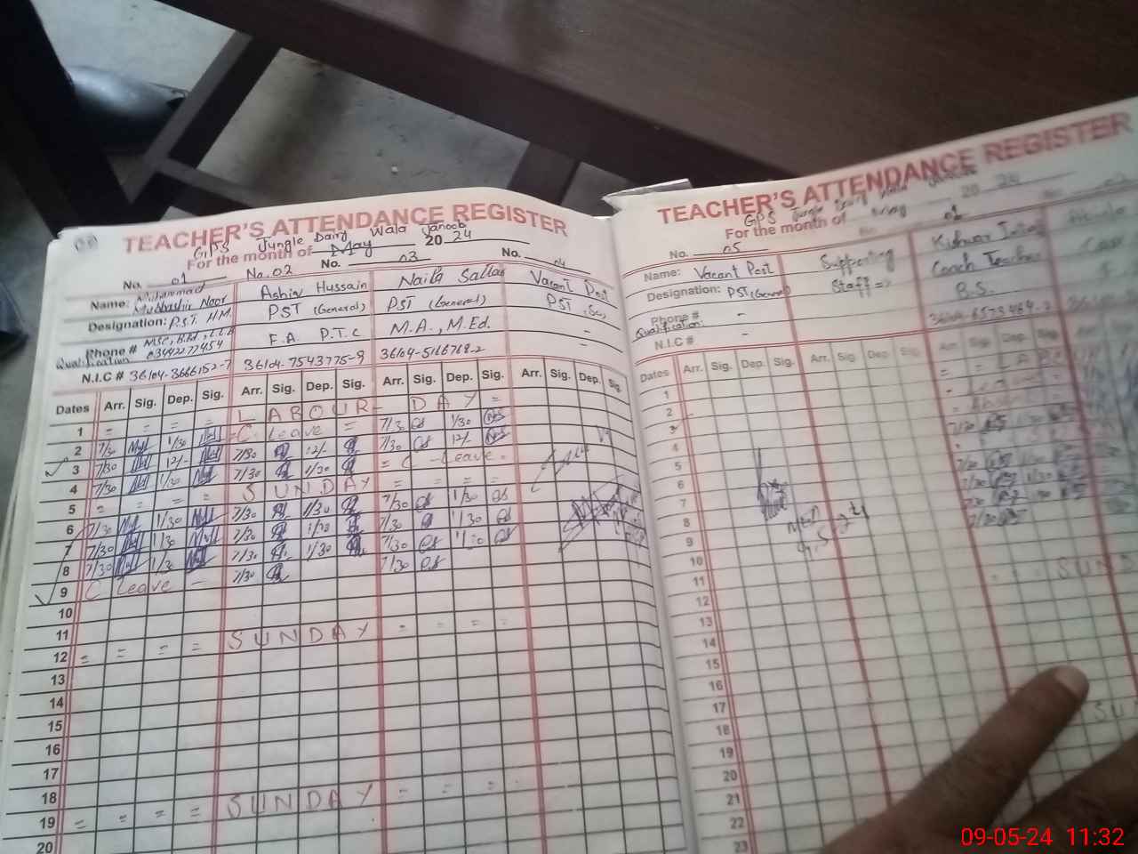 | CNIC | Full Name | Designation | R/C | Absence during last cal. month |