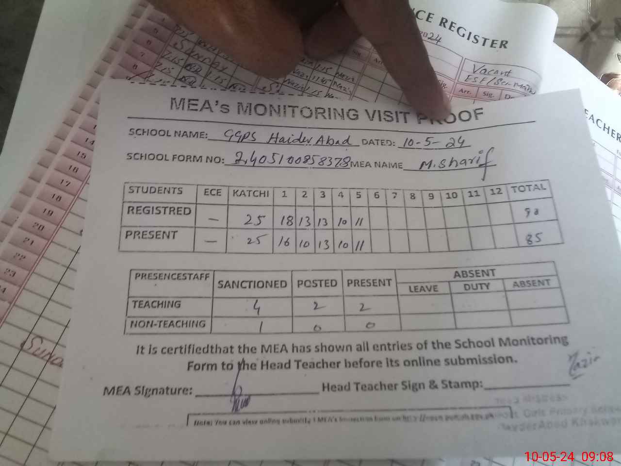 | Attendance Register | Head Teacher | MEA with School | Visit Proof |