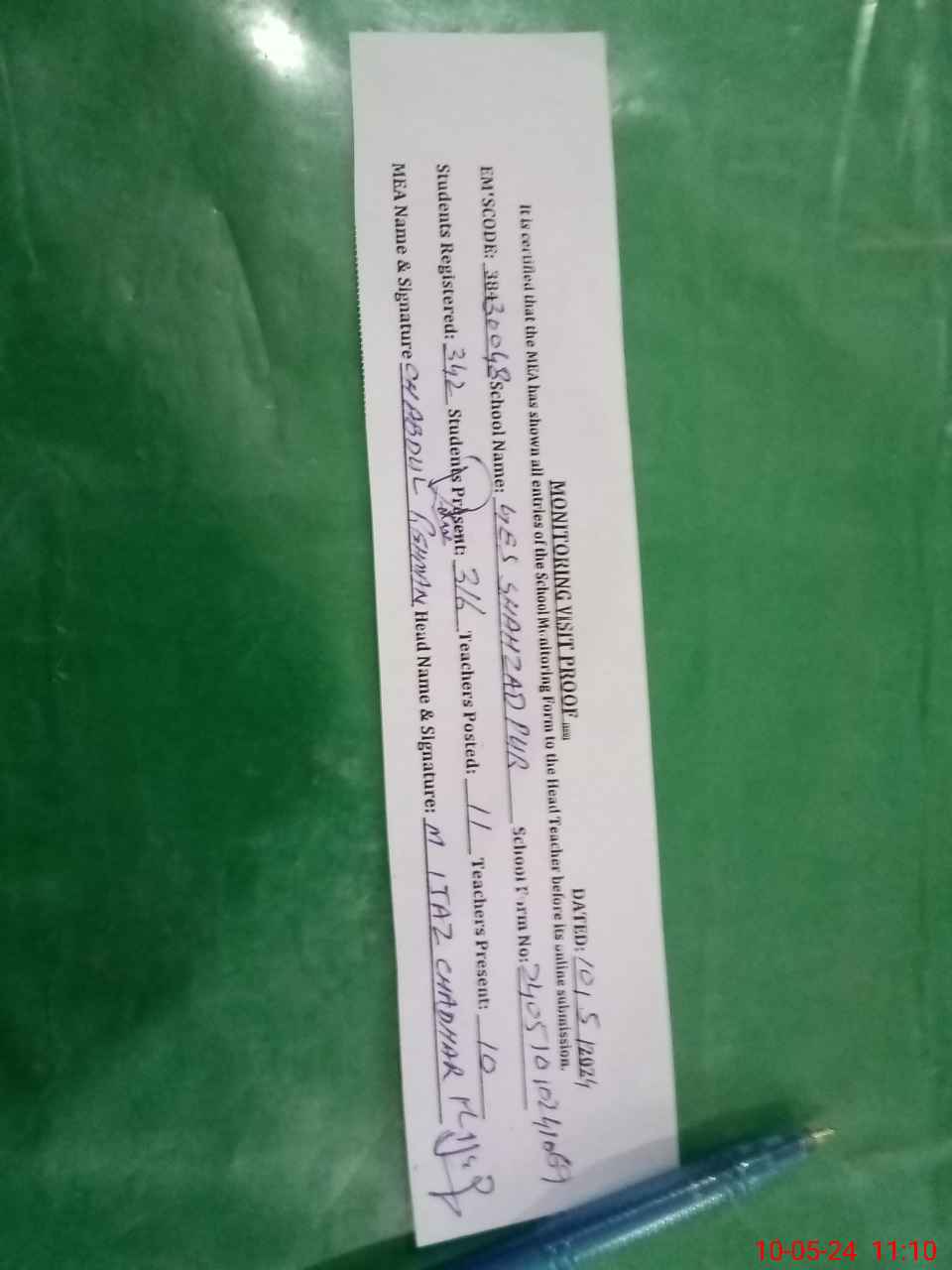 | Certified that this School was Inspected by the Undersigned MEA/DMO Today and the Information Stated Above is as Per Record. | |||||