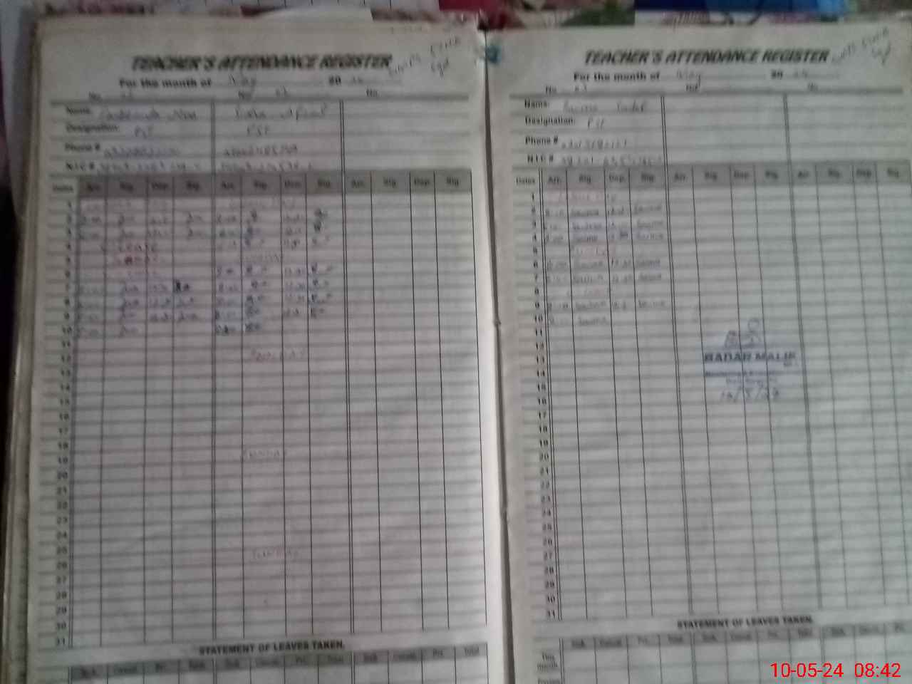 | CNIC | Full Name | Designation | R/C | Absence During Last Calender Month |
