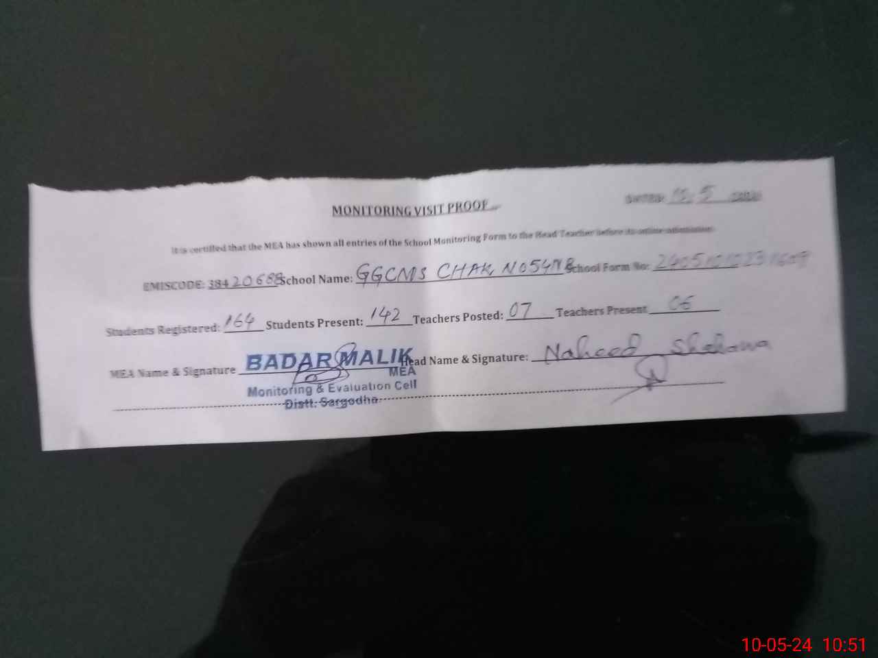 | Attendance Register | Head Teacher | MEA with School | Visit Proof |