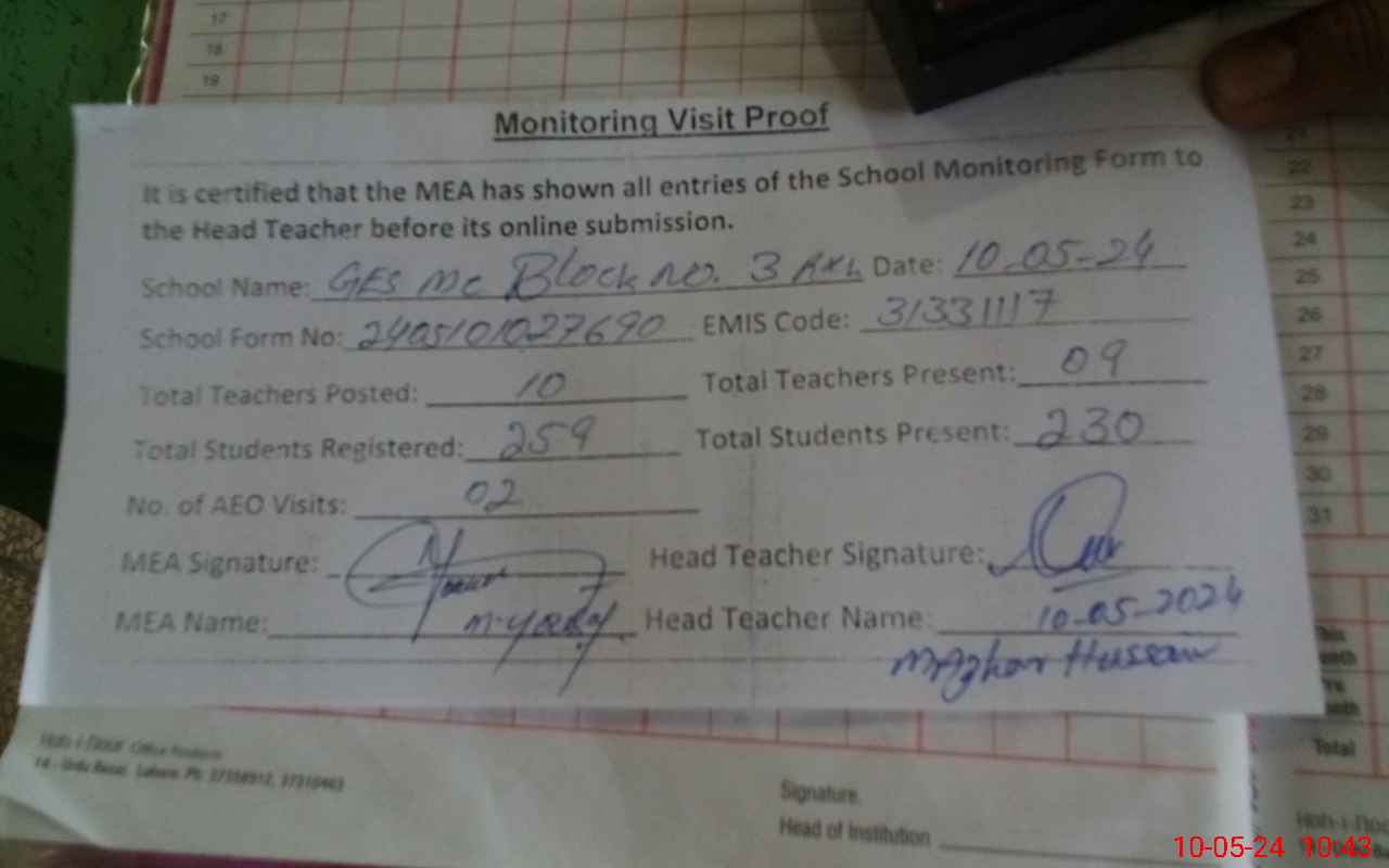 | Certified that this School was Inspected by the Undersigned MEA/DMO Today and the Information Stated Above is as Per Record. | |||||