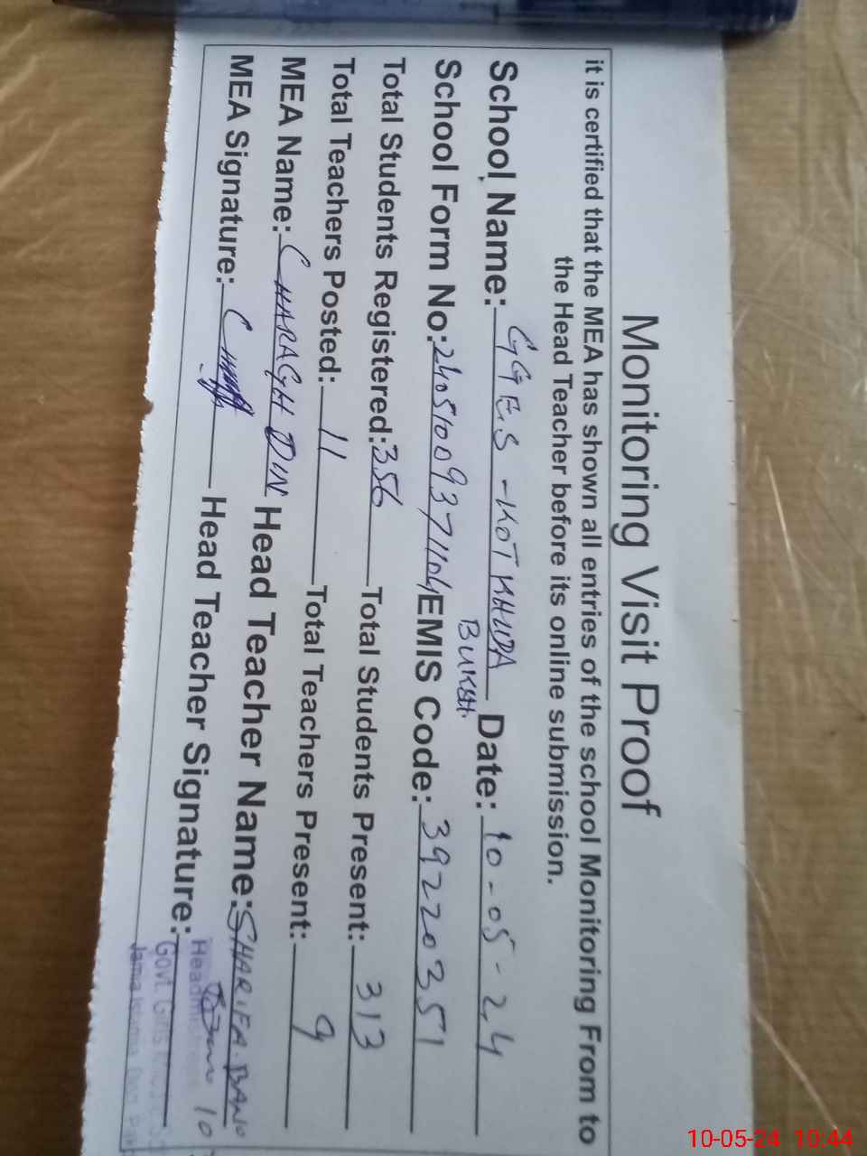 | Attendance Register | Head Teacher | MEA with School | Visit Proof |