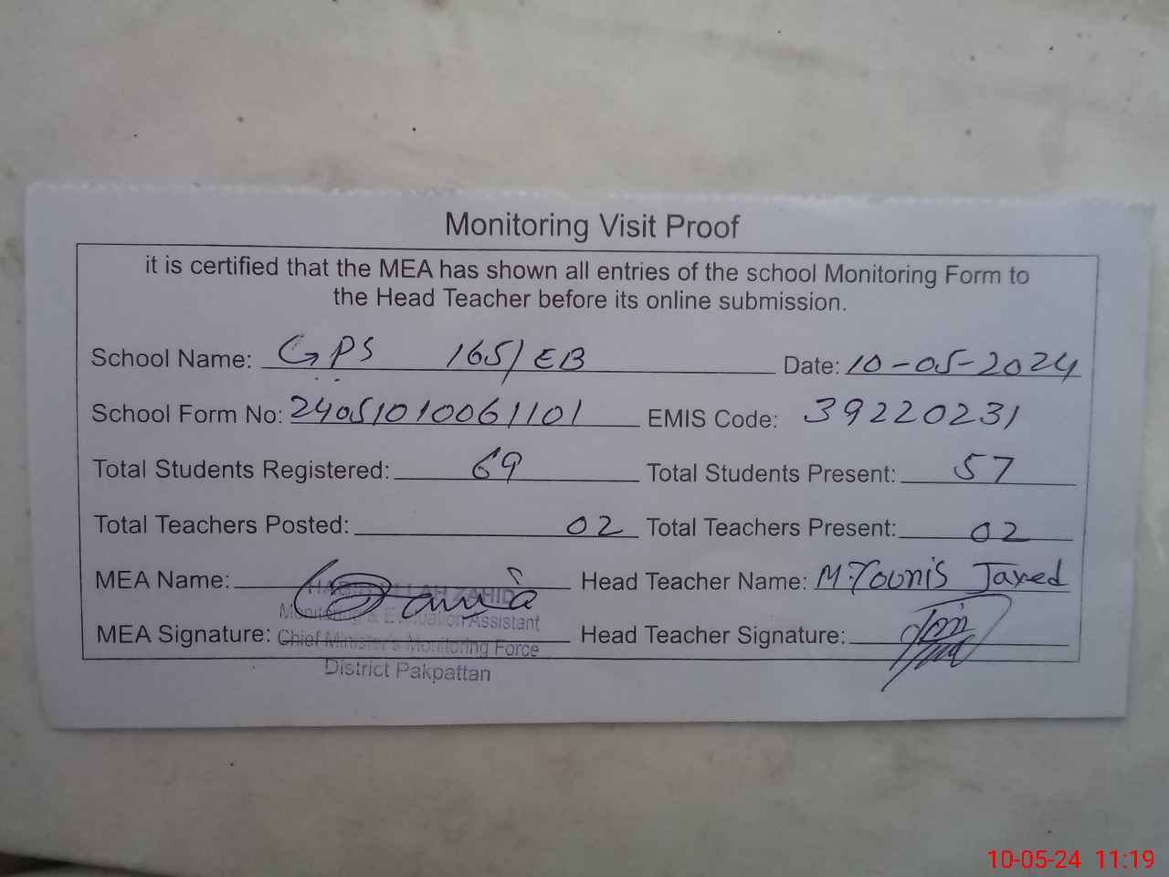 | EMIS Code: 39220231 | Name of School: GPS 165 EB P.O 163 E.B ARIF WALA | |||