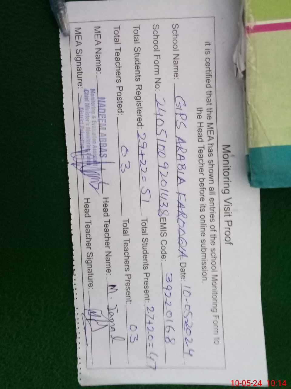 | Attendance Register | Head Teacher | MEA with School | Visit Proof |