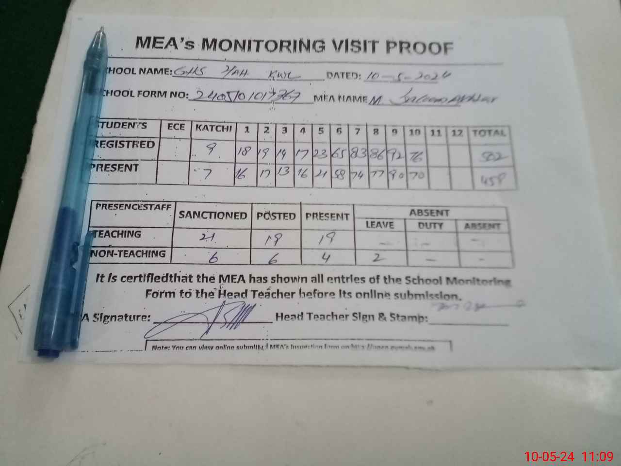 | Attendance Register | Head Teacher | MEA with School | Visit Proof |
