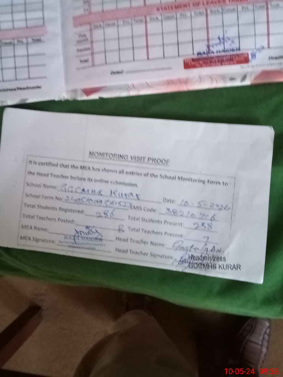 | EMIS Code: 38210716 | Name of School: GGCMHS KURAR | |||