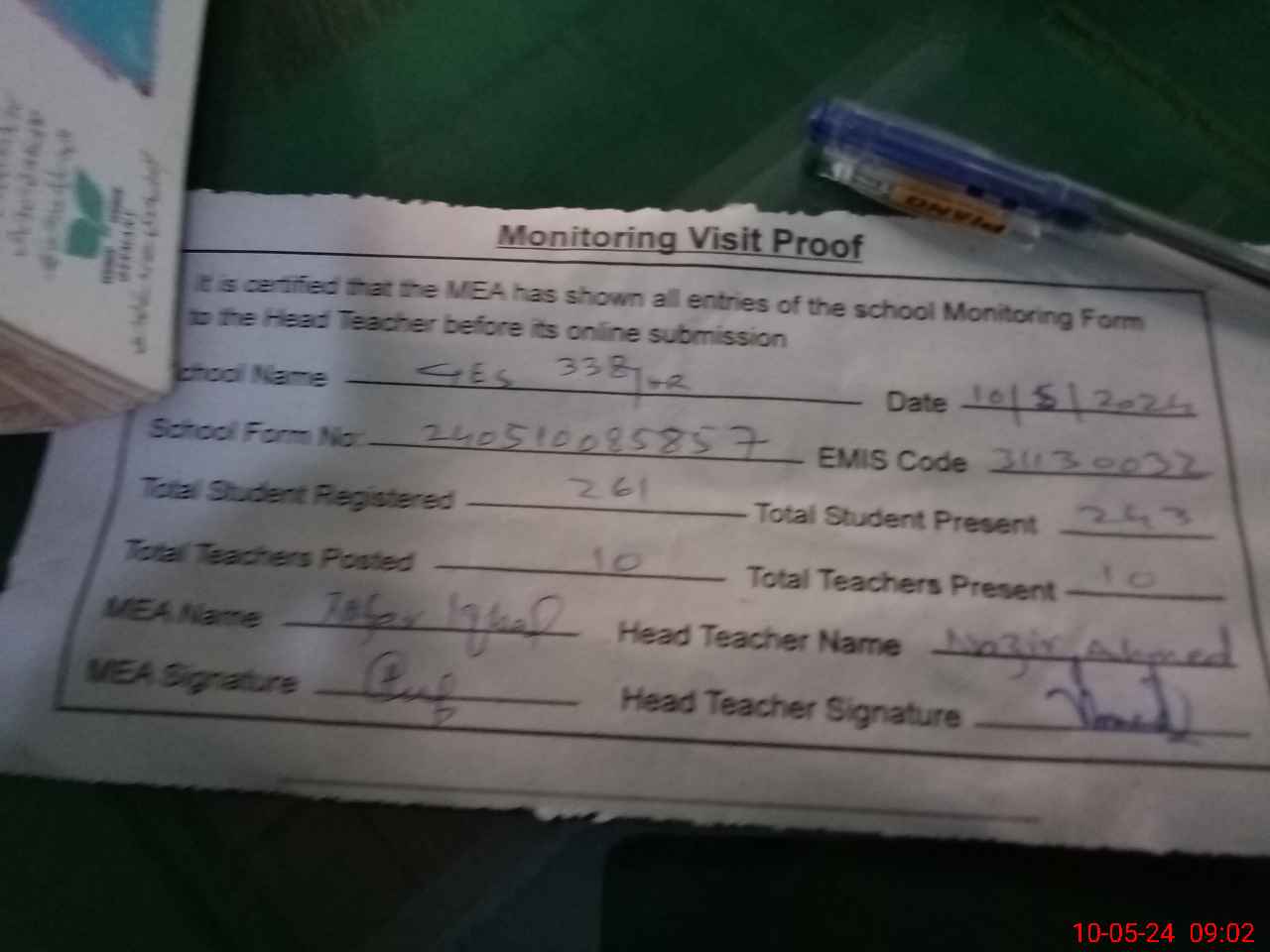 | Certified that this School was Inspected by the Undersigned MEA/DMO Today and the Information Stated Above is as Per Record. | |||||