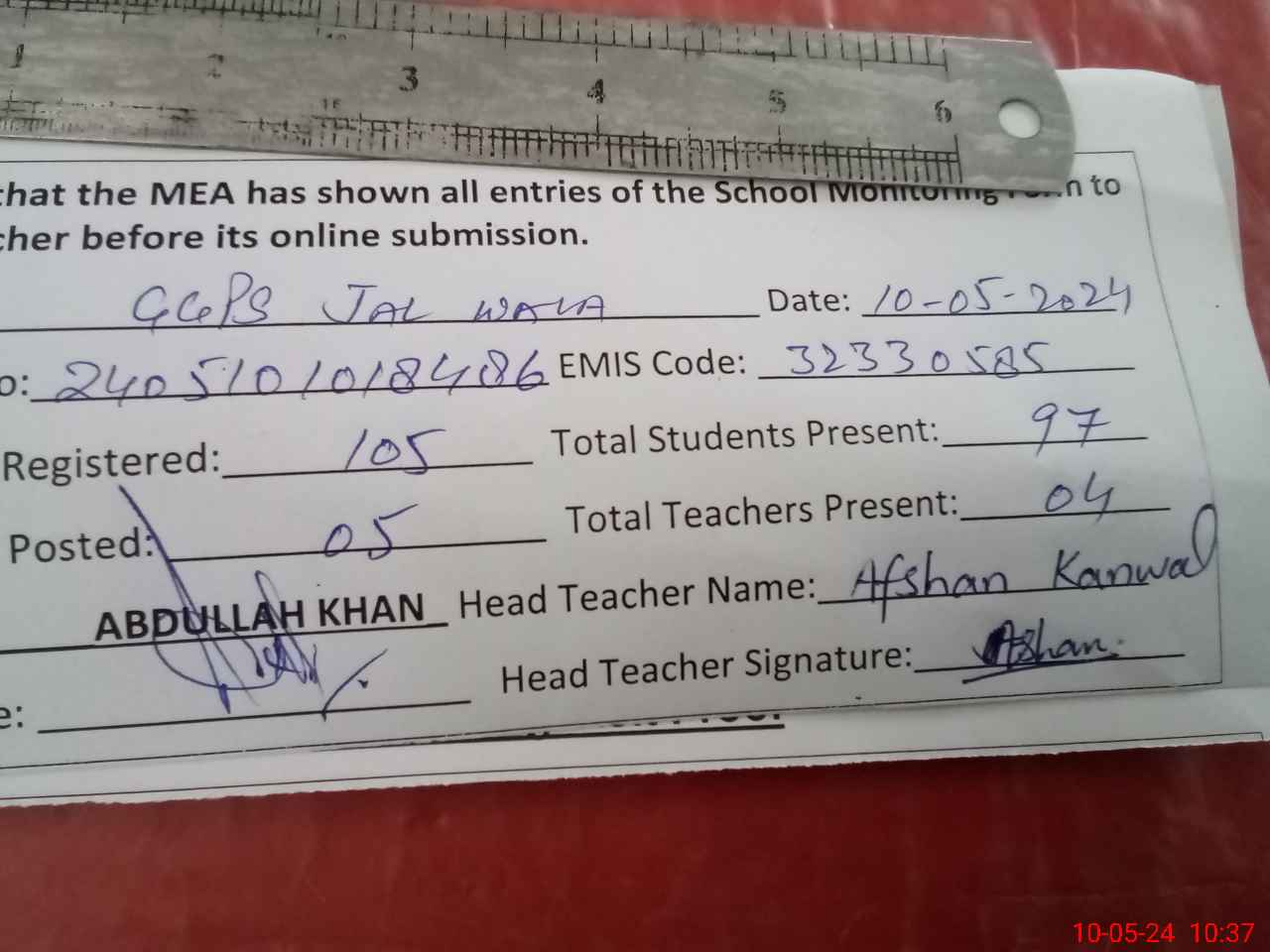 | Monitoring Date: 10-05-2024 | Start Time: 10-05-2024 10:18 AM | End Time: 10-05-2024 10:39 AM | Name of MEA: Ab**** Kh**** | |