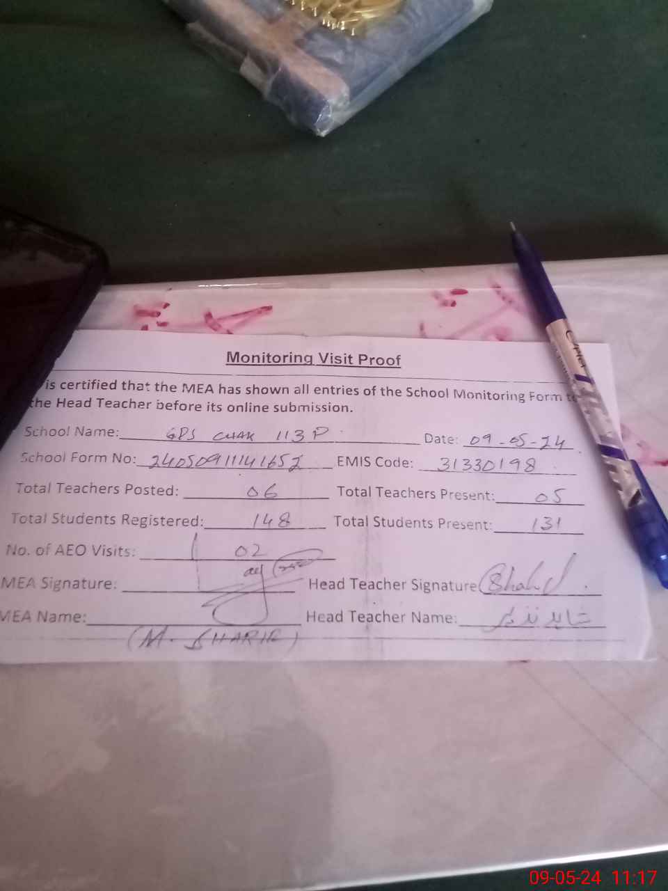 | Attendance Register | Head Teacher | MEA with School | Visit Proof |