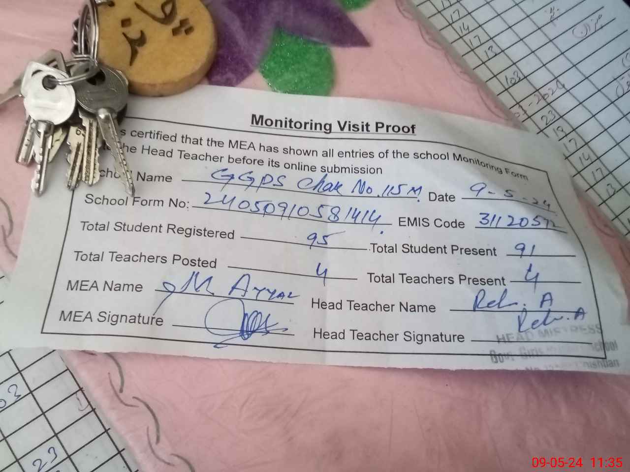 | Attendance Register | Head Teacher | MEA with School | Visit Proof |